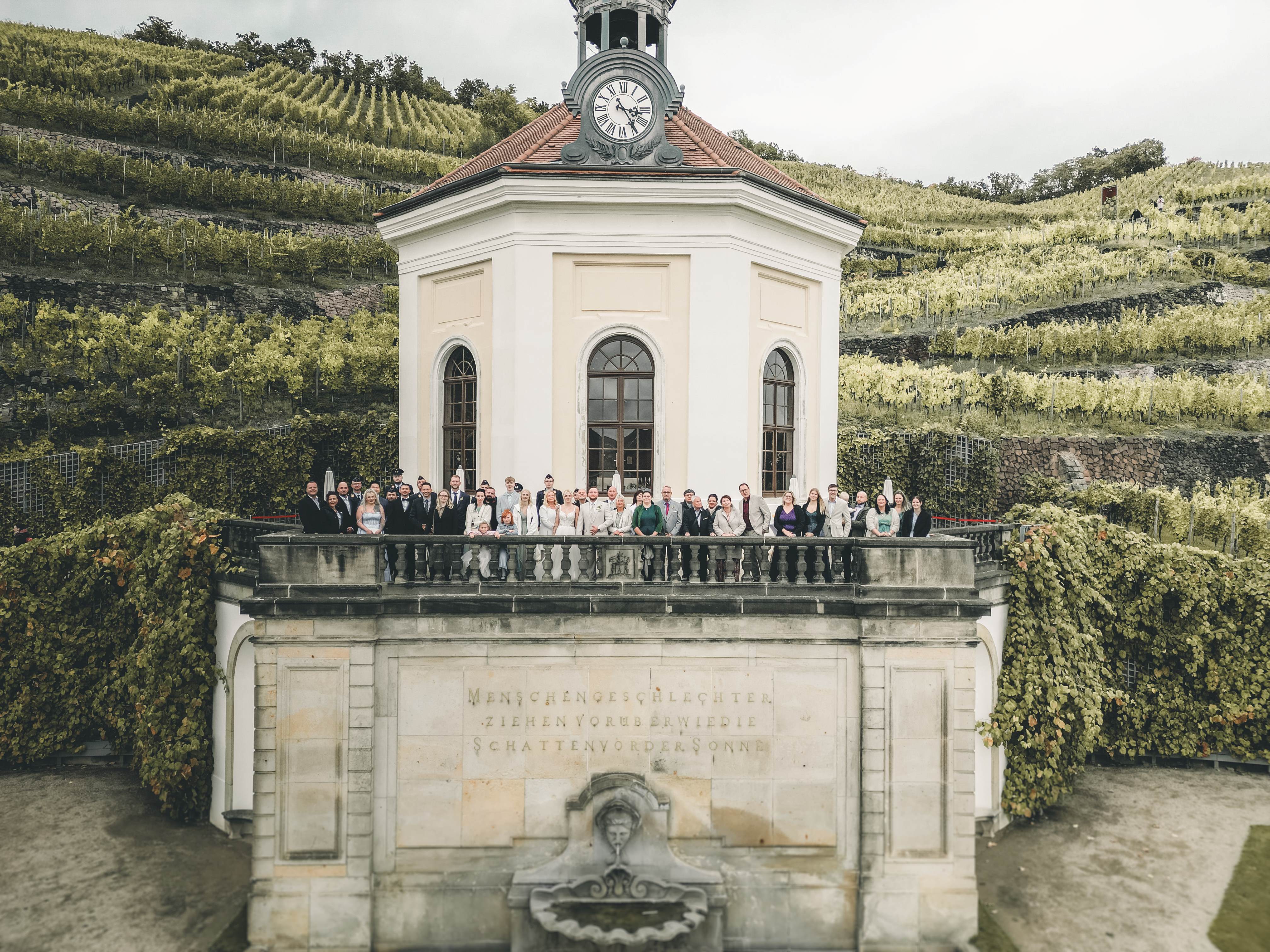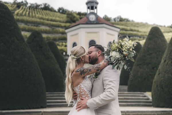 Auch für Hochzeitsfotos ist diese Location ideal: Zwischen barocken Gebäuden, Weinreben und Gartenanlagen entstehen zeitlose und elegante Bilder.